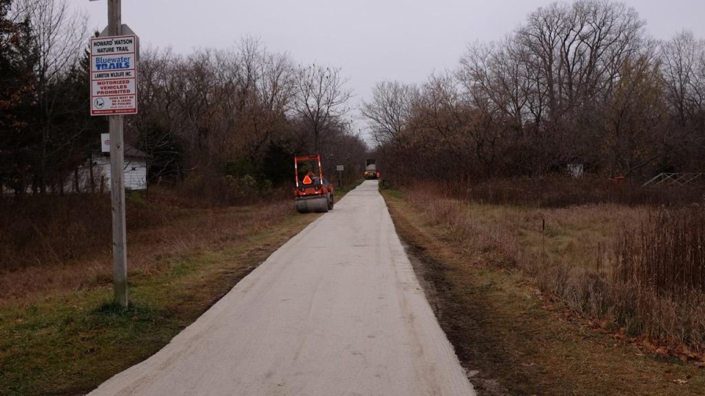The city, in concert with the Bluewater Trails Committee, is working to widen and smoothen portions of the Howard Watson trail. Here, just west of the Blackwell Road gateway, a work crew painstakingly applies fine screenings onto the trail. This creates a smooth, wider trail that is then ”rolled” to harden the surface.