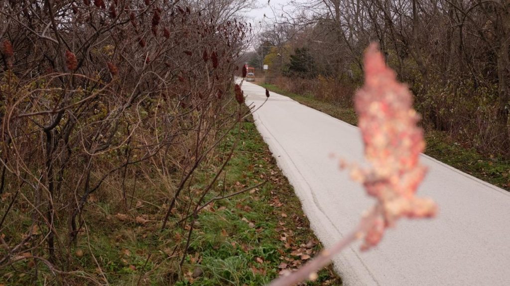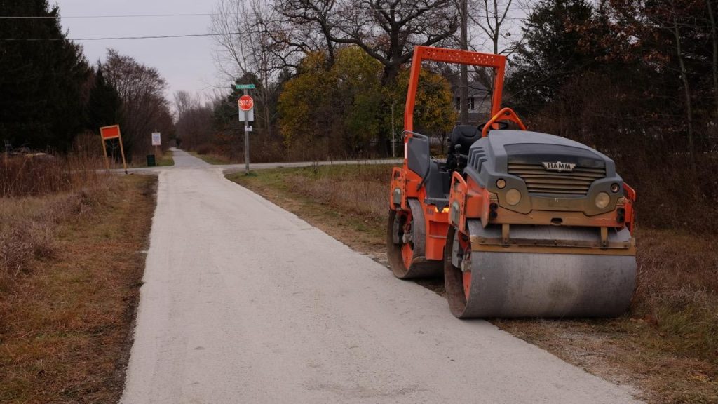 Here at the Blackwell gateway, looking west, a roller sits idle at trailside while in the distance two workers use a dump truck to drop the topping materials onto the pre-excavated trail bed.